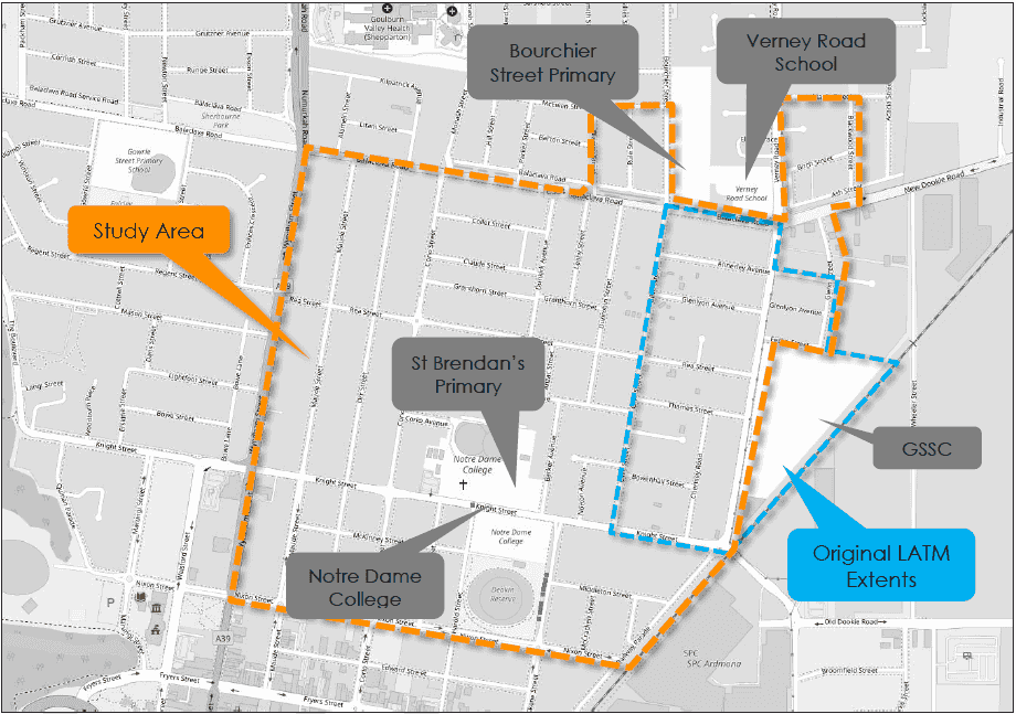 The Shepparton Inner North LATM study area is bounded by the GSSC campus site to the east; Balaclava Road, Bourchier Street Primary and Verney Road schools to the north; GV Highway to the west; and Nixon Street to the south.