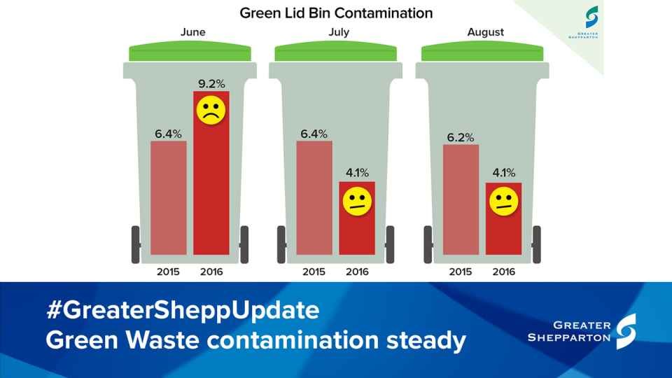 The contamination rate of the green lid bins for August was a low 4.05 per cent, a decrease of 2.29 per cent compared to August 2015 which was 6.4 per cent. Read more