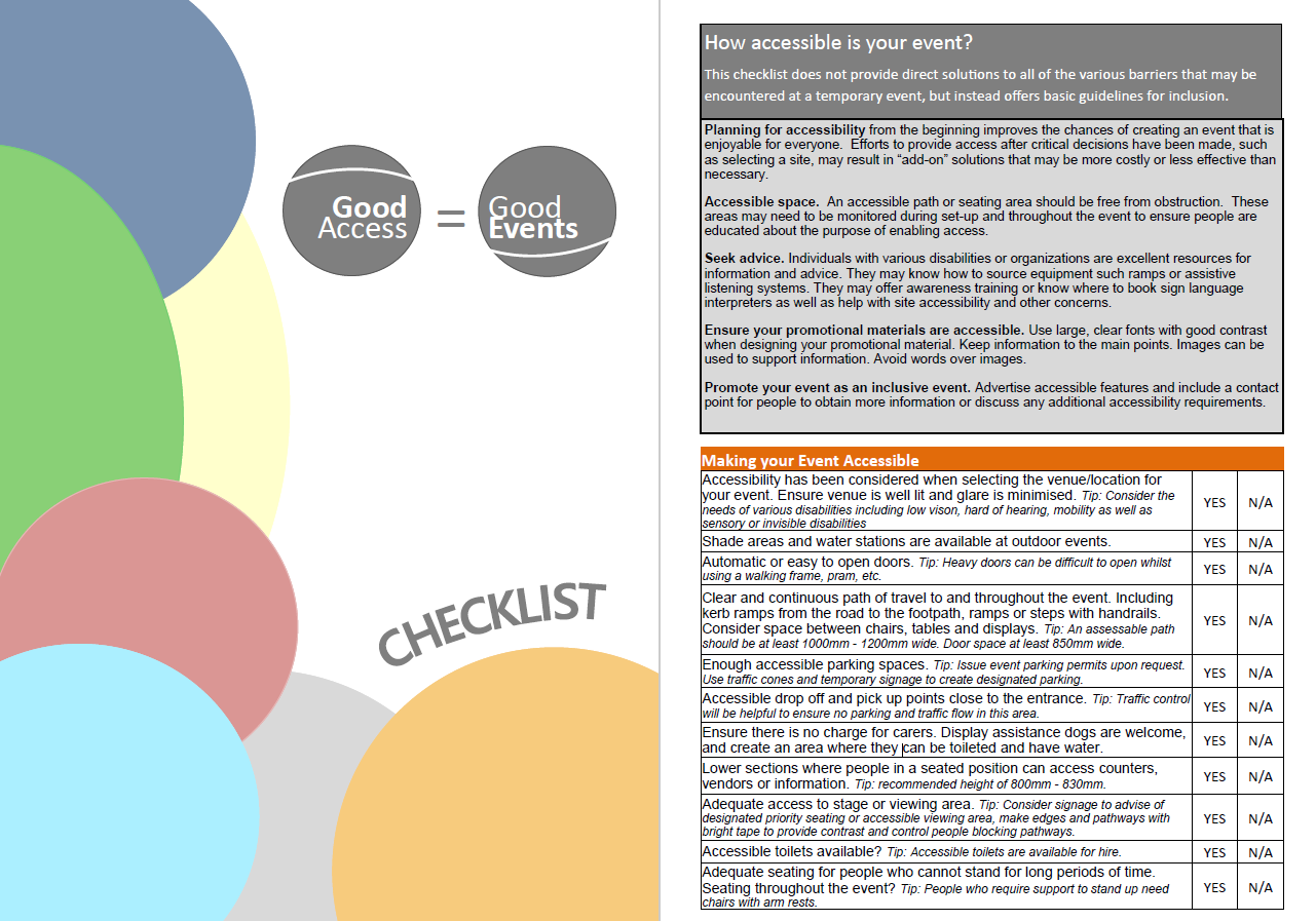Greater Shepparton City Council, in conjunction with West Hume Communication Access Network, Shire of Strathbogie and Moira Shire have developed the Good Access = Good Events checklist in the effort to promote an understanding of diversity in the community and support the development of inclusive communities.