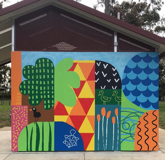 The Committee received funding through Council’s Community Planning Implementation Fund to support Rachel to paint the mural, collaborating with senior students from Sacred Heart School Tatura and Tatura Primary School to come up with a design. Focusing on the themes of earth, sun and water and using the natural environment of Lake Bartlett as inspiration, the students used colour, shape and pattern to express their ideas which Rachel then used to pull together the final design.