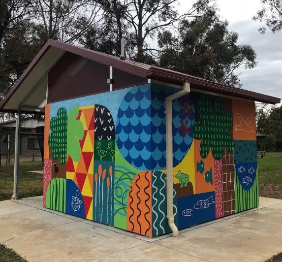 Tatura artist Rachel Doller has brightened up the newly installed public toilets at Lake Bartlett in Tatura with a colourful mural designed by local students.