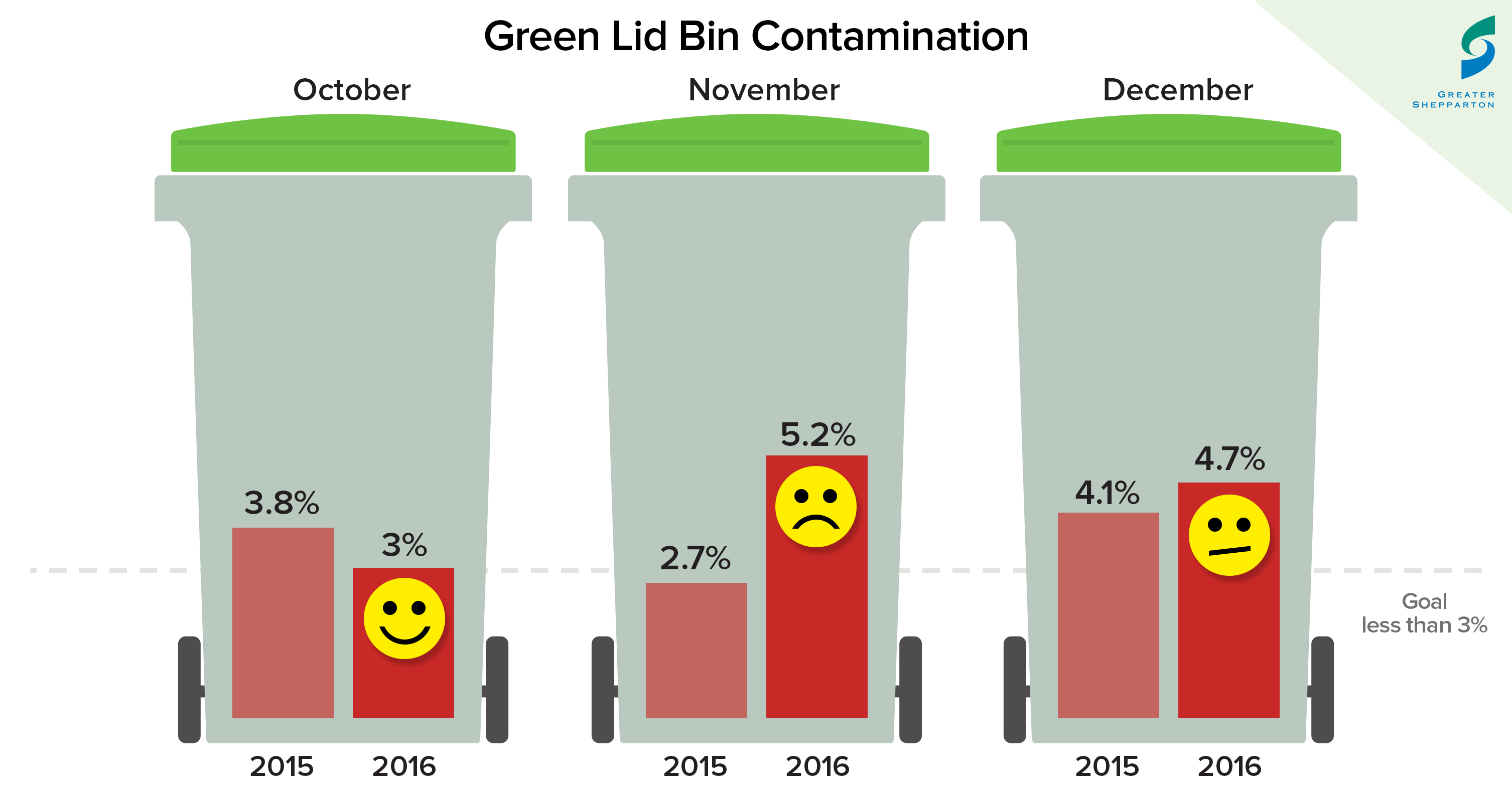 Contamination of the organic green lid bins dropped for the month of December 2016 to 4.68 per cent from 5.24 per cent in November but there are still improvements to be made.