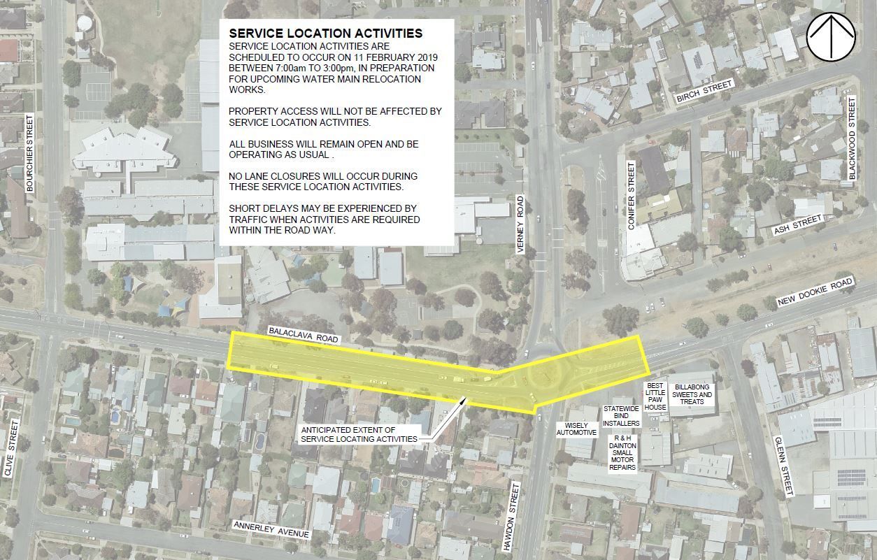 Contractors will be onsite locating services from Monday 11 February and construction works will follow commencing with works on water mains on New Dookie Road and Balaclava Road. Works on water mains in Verney Road and Hawdon Street will follow. Lane closures requiring detours through adjacent streets will be in effect for some stages of the works in conjunction with restrictions to on-street parking. Heavy vehicle detours via Wheeler Street for west bound traffic will be used when required to facilitate works and reduce congestion.